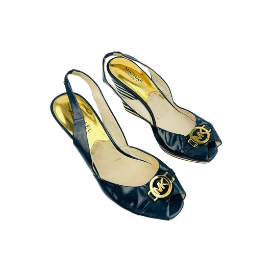 Michael Kors Navy Logo Wedge Slingback Heels (Size 38)