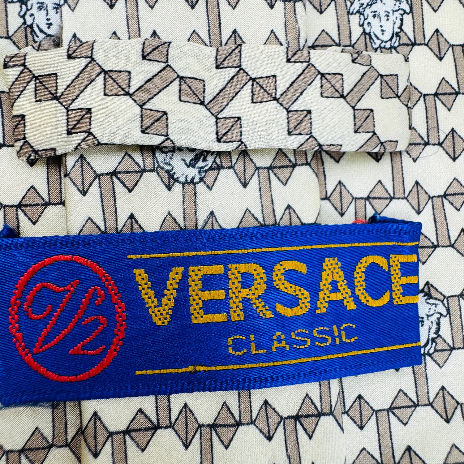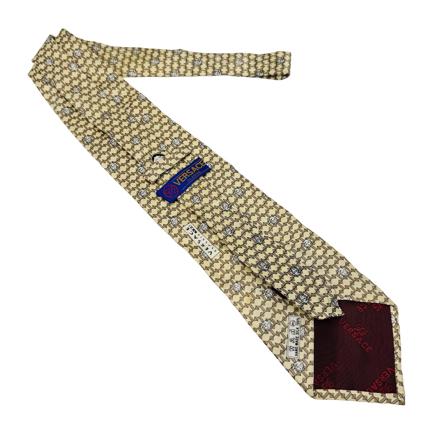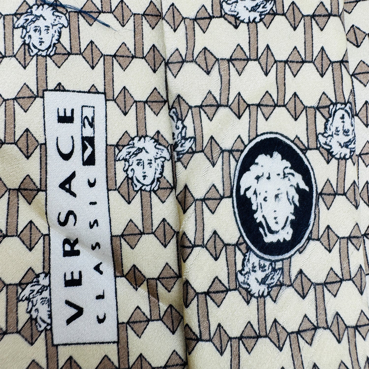 - Color: Beige with Brown Geometric Pattern and Black/White Medusa Head Print (Signature Versace Element)